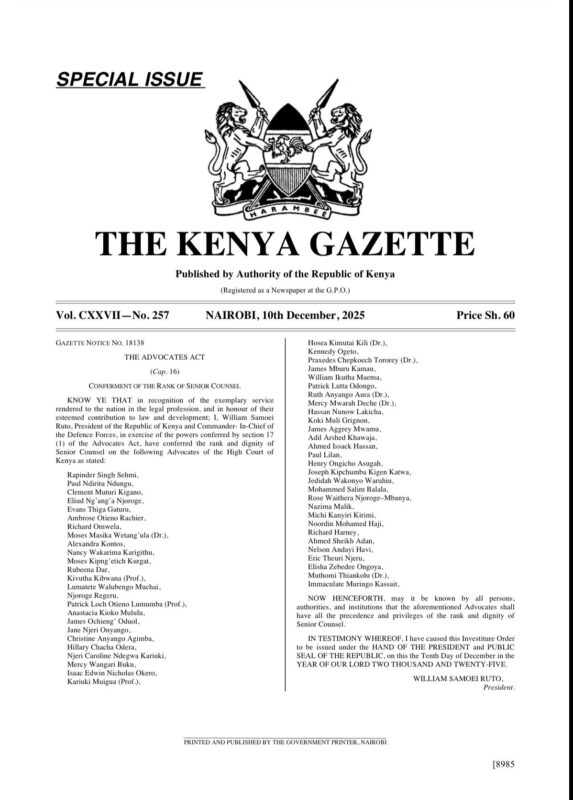The legal landscape in Kenya has undergone a seismic shift following a recent Kenya Gazette notice announcing the conferment of 54 new Senior Counsels, effectively doubling the elite rank from 66 to a historic 120. This massive batch marks the largest conferment of the prestigious title in recent years.